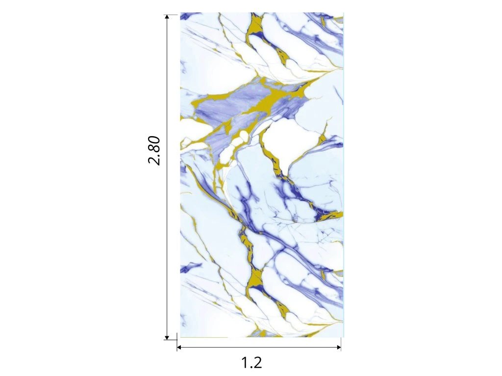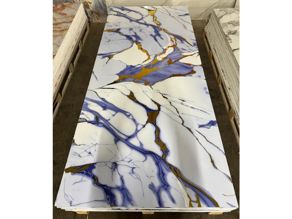 PVC nástěnný panel v modrých, bílých a zlatých tónech, ideální pro moderní a luxusní interiéry.